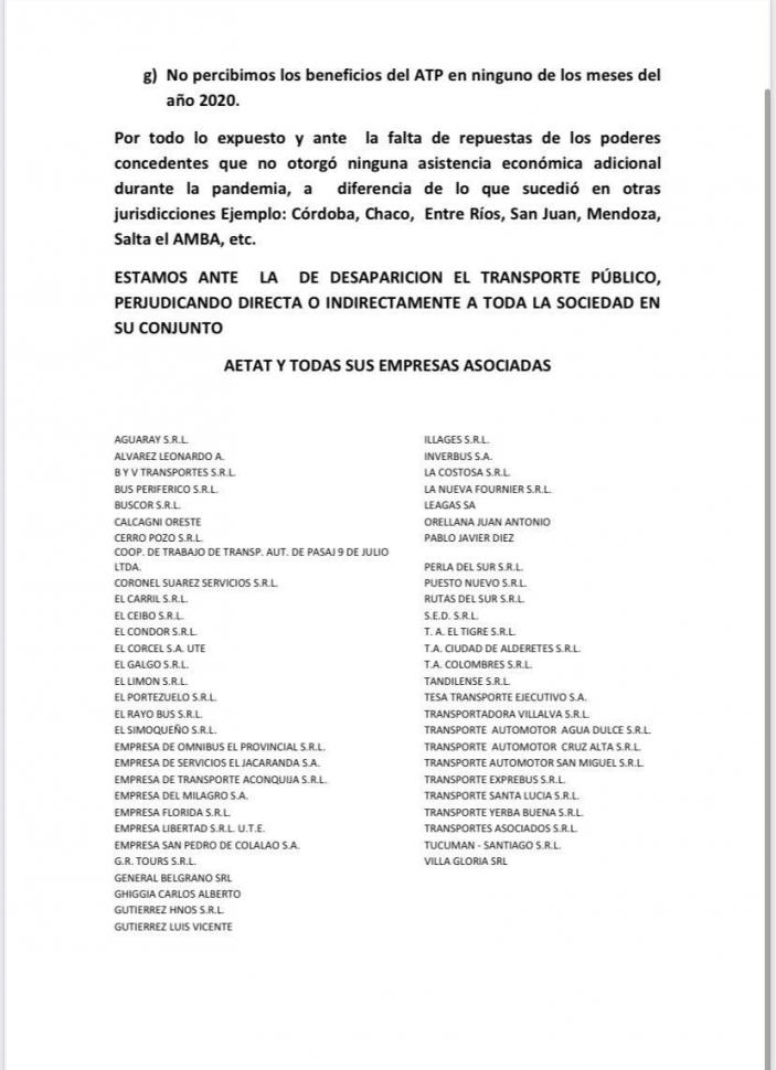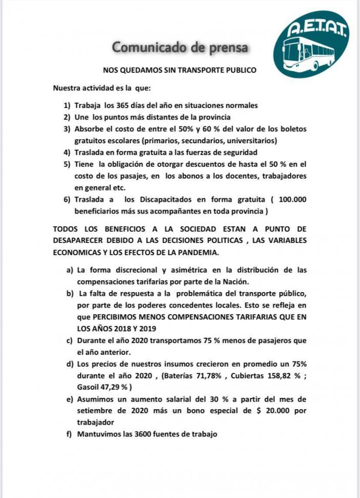 AETAT emitió un comunicado advirtiendo que "todos los beneficios a la sociedad están a punto de desaparecer debido a las decisiones políticas, las variables económicas y los efectos de la pandemia" y también que "estamos ante la desaparición del transporte público, perjudicando directa o indirectamente a toda la sociedad en su conjunto".