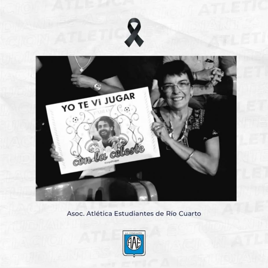 “Estudiantes de Río Cuarto lamenta el fallecimiento de Mary Giordano; madre de Andrés y Pablo Aimar, reconocidos y queridos jugadores de nuestra institución. Acompañamos a toda la familia Giordano-Aimar en este momento. El más cálido y sentido abrazo del pueblo celeste. QEPD”, fue el mensaje que pronto se llenó de mensajes de condolencias.