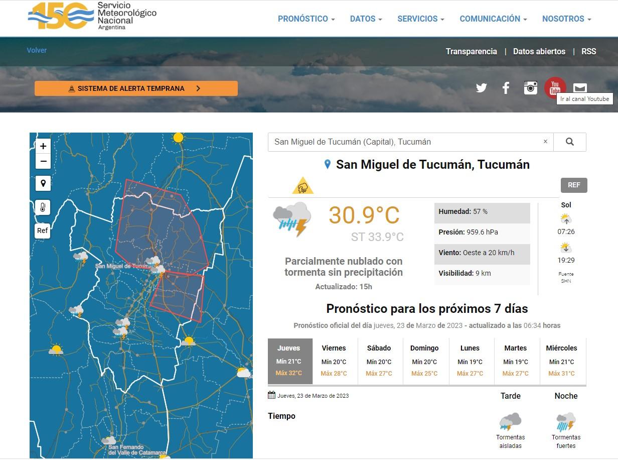 El Servicio Meteorológico Nacional, pronostica una jornada inestable y en alerta por fuertes tormentas para Tucumán, este día jueves