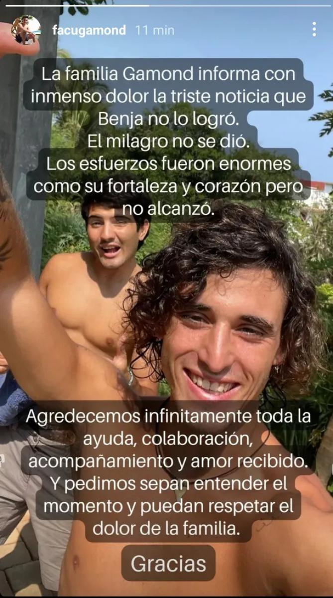 "Benja no lo logró. El milagro no se dio", comunicó la familia de Benjamín Gamond, el joven atacado a machetazos en una playa mexicana