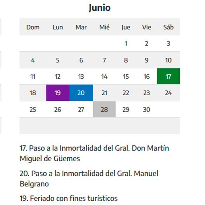 Ese día es el primero de cuatro de descanso, pues el domingo es inhábil y el lunes 19 de junio es el llamado feriado puente, al cual se sumará el del martes 20, fecha en la que se recuerda el “Paso a la Inmortalidad del Gral. Manuel Belgrano.