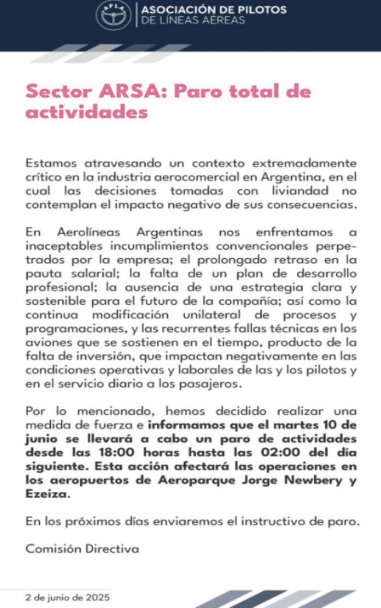 La Asociación de Pilotos de Líneas Aéreas (APLA) informó este lunes que llevará adelante un paro total de actividades el próximo martes 10 de junio, entre las 18:00 y las 02:00 del día siguiente. La medida afectará las operaciones de Aerolíneas Argentinas en los aeropuertos Jorge Newbery (Aeroparque) y Ministro Pistarini (Ezeiza).