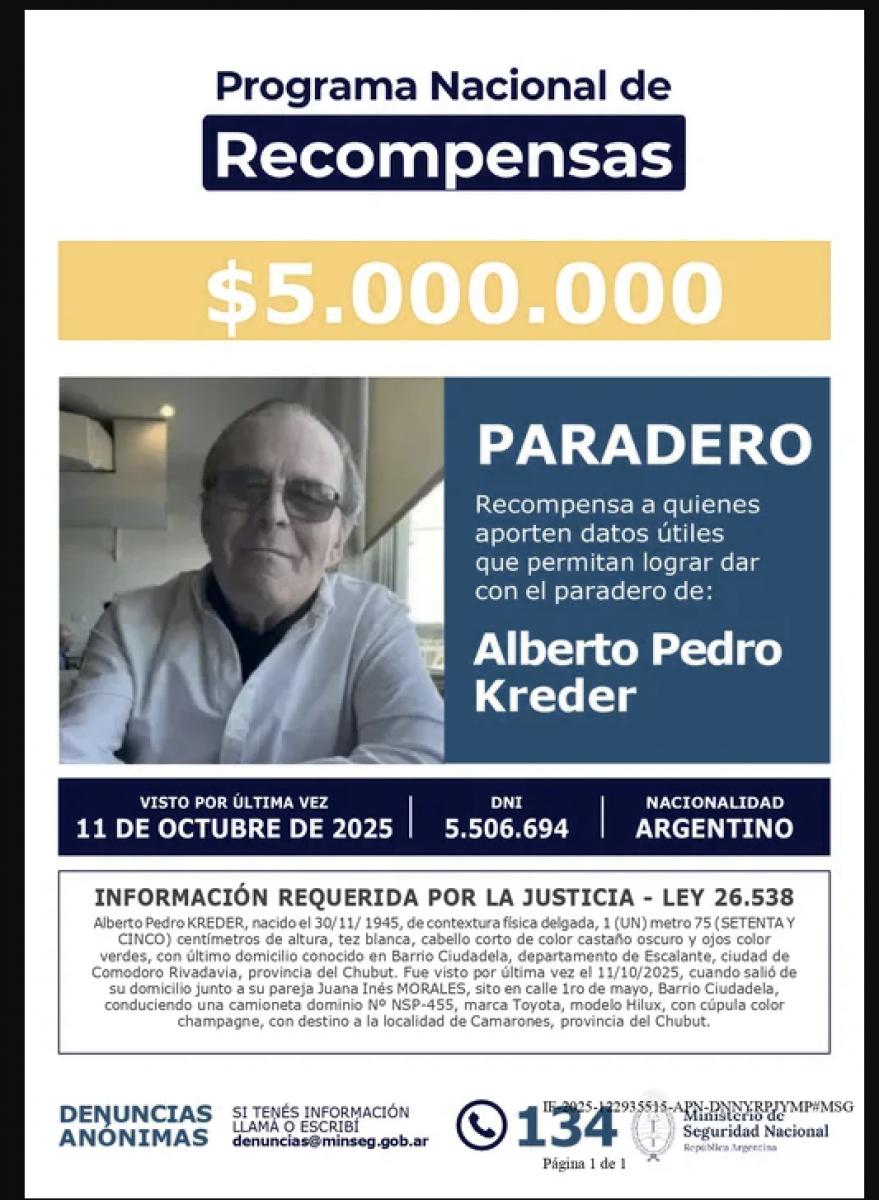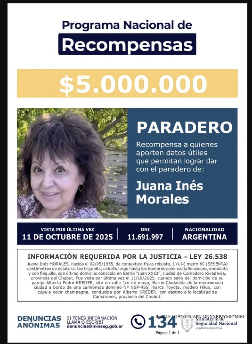El Gobierno Nacional, a través del Ministerio de Seguridad Nacional, ofrece una recompensa para encontrar a Juana Inés Morales y Alberto Pedro Kreder, la pareja de jubilados que desapareció a mediados de octubre de este año en la provincia de Chubut.