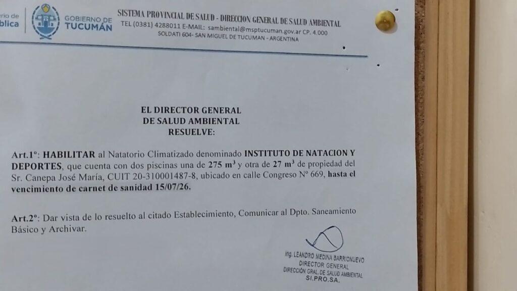 La habilitación provincial se concedió mediante la Resolución N°492/DGSA-2025, firmada el 22 de diciembre de 2025, que autorizaba al “Natatorio Climatizado Instituto de Natación y Deportes” a operar hasta el 15 de julio de 2026. El permiso indicaba que las dos piscinas del lugar, de 275 m³ y 27 m³, cumplían con los requisitos técnicos y que el agua estaba dentro de los parámetros bacteriológicos exigidos por la normativa. Además, el expediente registraba documentación sobre seguros, análisis de agua y habilitación de guardavidas.