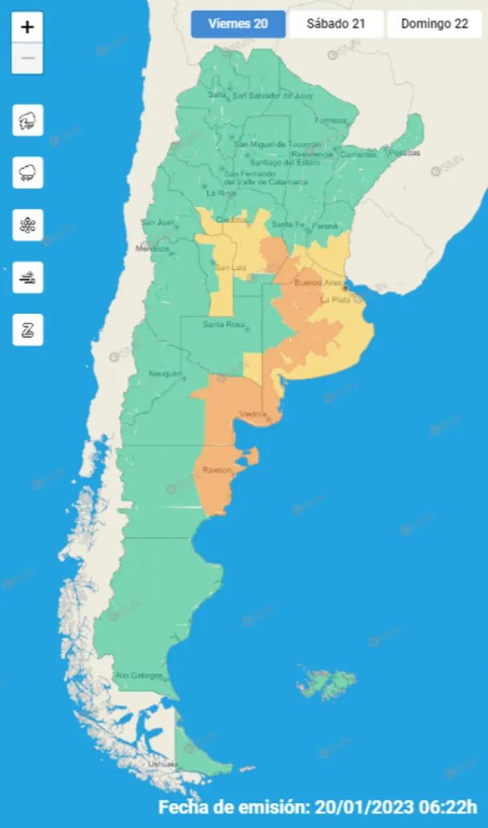 La ciudad de Buenos Aires, La Plata y localidades del este y sur bonaerense se encuentran bajo alerta amarilla, mientras que los departamentos del centro y oeste de la provincia están bajo alerta naranja.