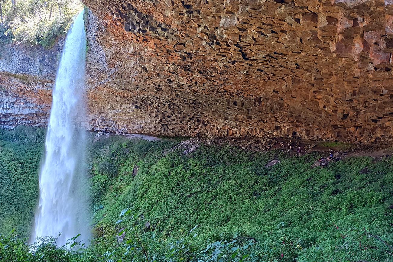 El espectacular salto de agua, en medio de una olla de piedras gigante rodeada de vegetación, se puede experimentar desde todos los ángulos y es el premio a tres horas de caminata intensa