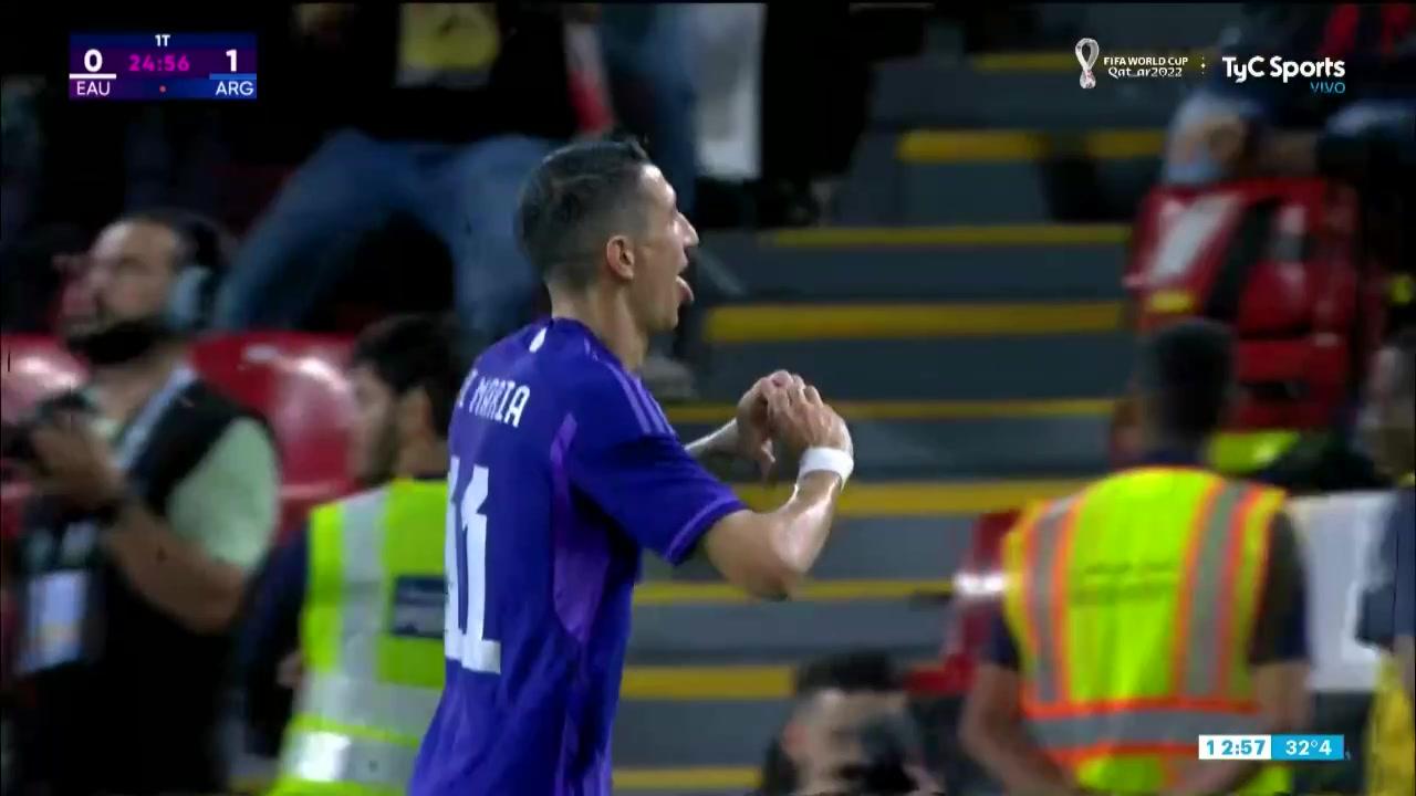 A los 25´ del primer tiempo. Gol de Di María de volea. Argentina 2- Emiratos Árabes 0