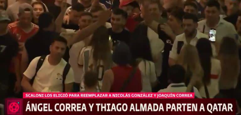 Los últimos convocados del equipo de Lionel Scaloni, Ángel Correa y Thiago Almada, llegaron esta madrugada a Ezeiza en medio de una algarabía multitudinaria