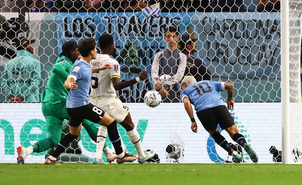 MINUTO 31: ¡GOL DE URUGUAY! Otra vez Giorgian De Arrascaeta. El mediocampista del Flamengo la tomó de volea dentro del área tras un pase colgado de Suárez y dejó sin posibilidad de respuesta al arquero de Ghana.