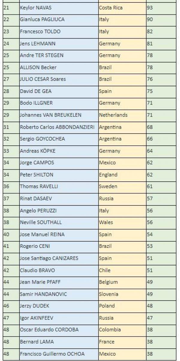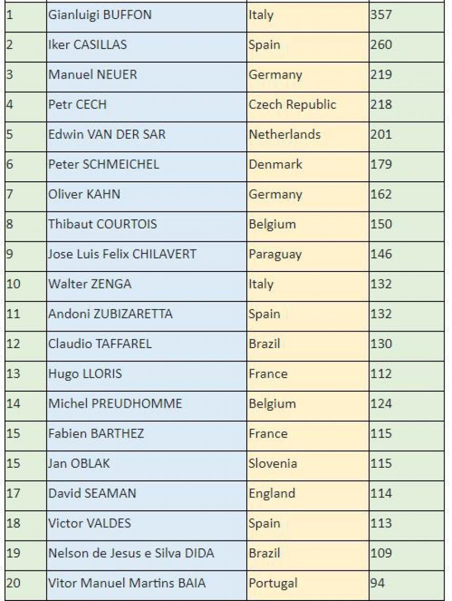 La lista quedó encabezada por el italiano Gianluigi Buffon (357 puntos), el segundo escalón fue para el español Iker Casillas (260 puntos), mientras que el tercer puesto es propiedad del alemán Manuel Neuer (219 puntos), el checo Petr Cech (218 puntos) y el neerlandés Edwin Van der Sar (201 puntos) completaron el Top 5 de los mejores arqueros según el ranking.