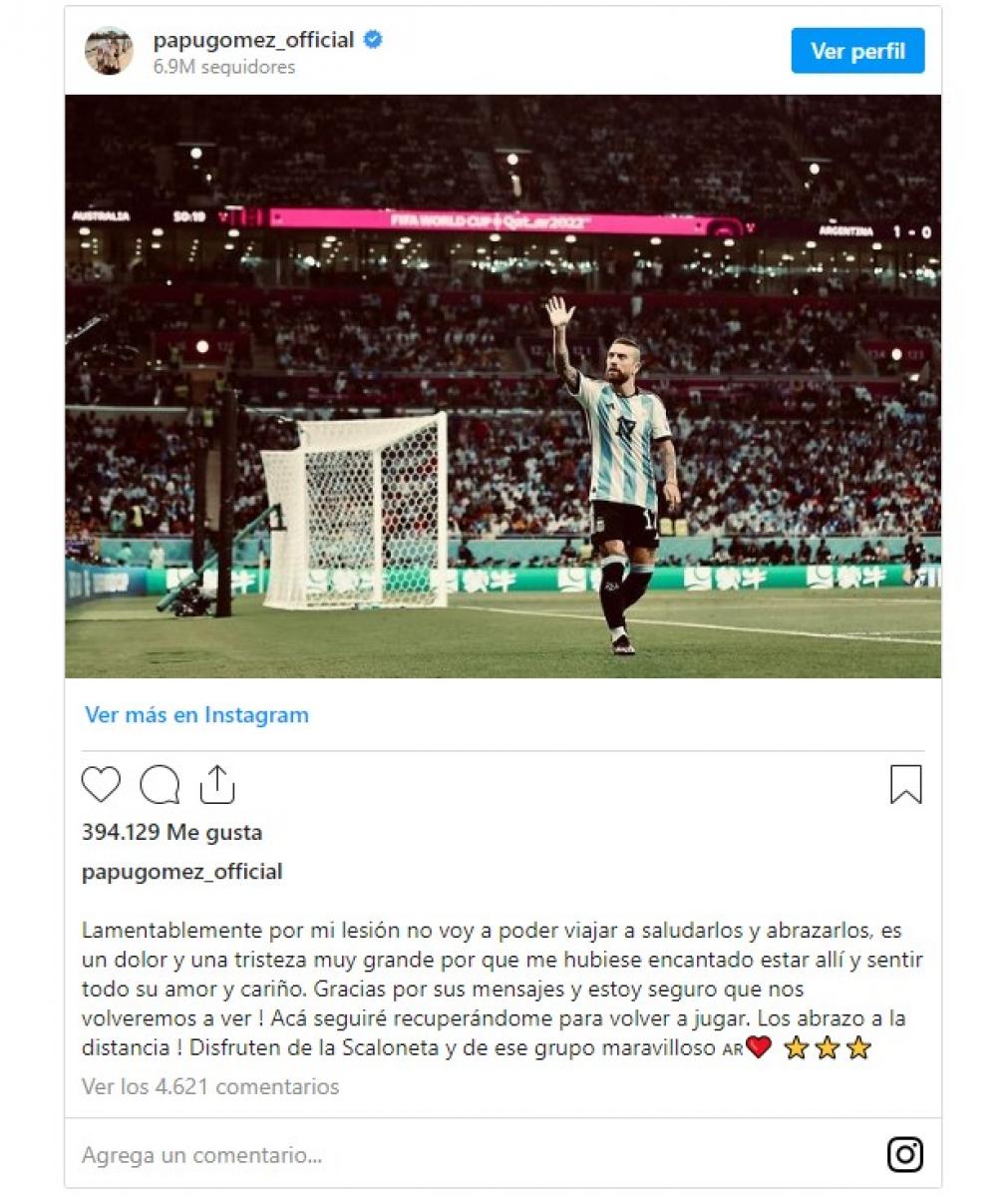 Gómez, de 35 años, se recupera de una lesión en el tobillo que sufrió en el cruce de octavos de final del Mundial ante Australia , y se perderá los partidos ante Panamá, en el Monumental, y Curazao, en Santiago del Estero.