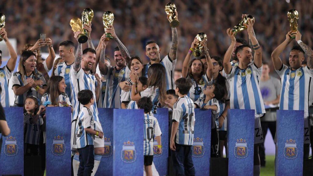"Quiero darles las gracias a ustedes por todo el cariño que venimos recibiendo, no solo por ser campeones del mundo sino desde antes, de la Copa América. Habíamos dicho que íbamos a hacer todo lo posible por esto", repasó el astro mientras acariciaba el trofeo y recibía otra ovación