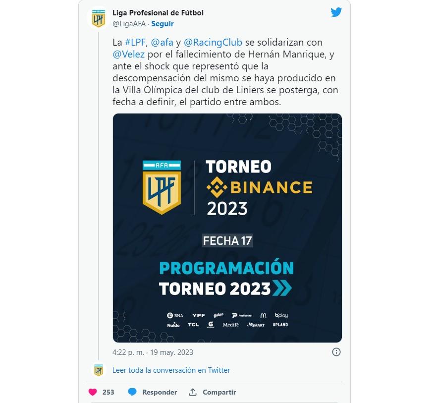 "La Liga Profesional, AFA y Racing se solidarizan con Vélez por el fallecimiento de Hernán Manrique, y ante el shock que representó que la descompensación del mismo se haya producido en la Villa Olímpica del club de Liniers se posterga, con fecha a definir, el partido entre ambos", reza el comunicado oficial.