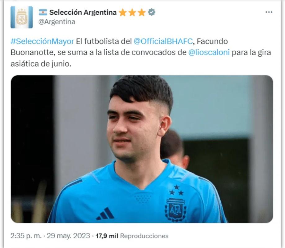 Un par de días después de haber dado la lista de la Selección Argentina para la gira asiática de junio, el técnico Lionel Scaloni sorprendió e incluyó a un nuevo convocado. Se trata de Facundo Buonanotte, quien no pudo disputar el Mundial Sub 20 por la negativa de Brighton, pero ahora tendrá su gran chance con la Mayor.