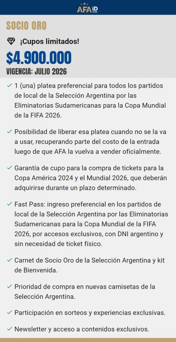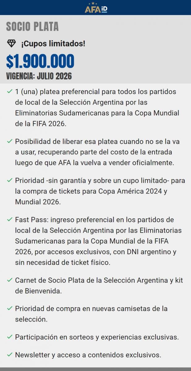 Los costos para quienes se inscriban en este nuevo acceso prioritario mediante el sitio portal.afa.com.ar van desde los $24.000 hasta $4.900.000.
