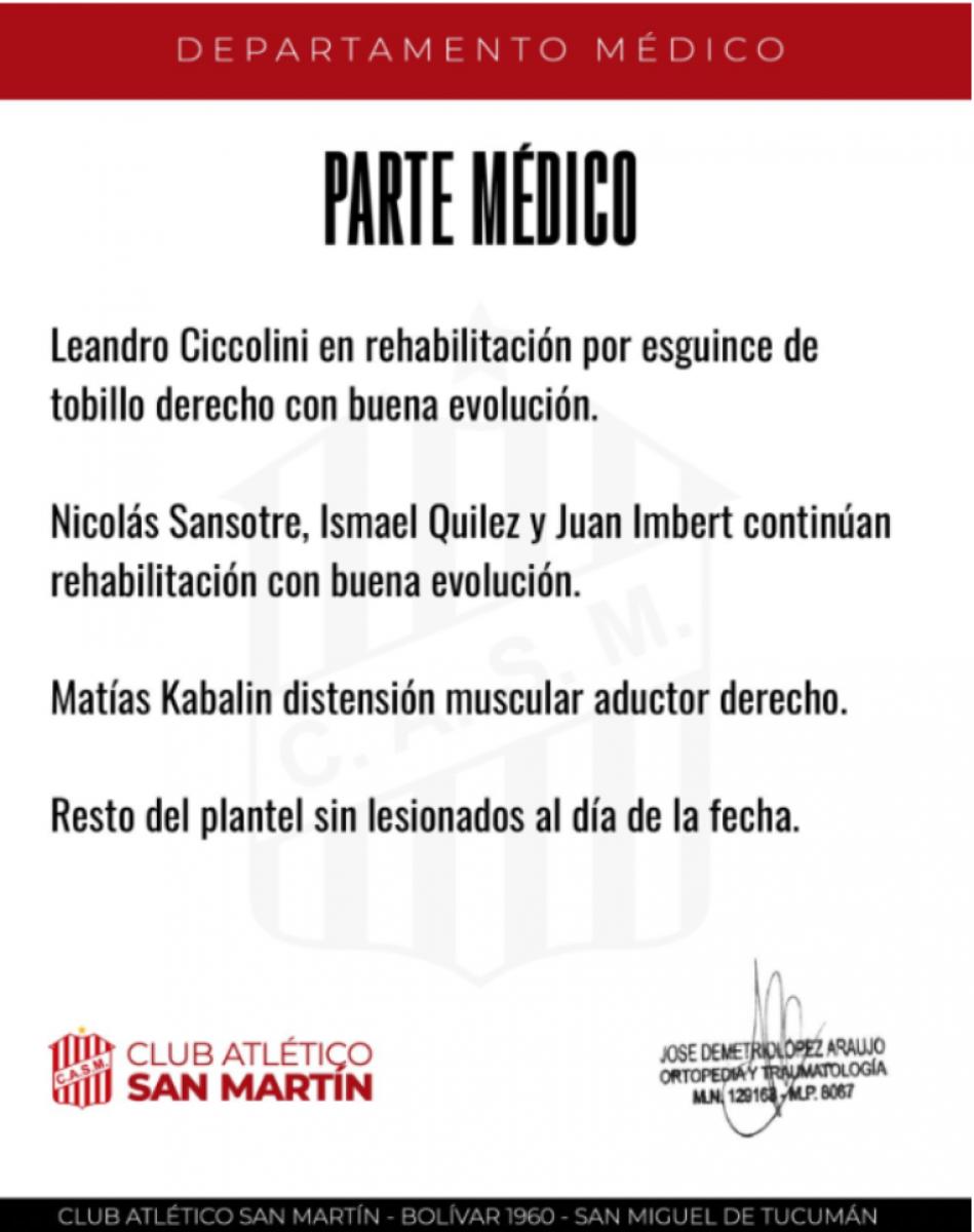 El Santo tendrá dos bajas obligadas ya que Brian Andrada y Leandro Ciccolini (el futbolista además sufre de una esguince de tobillo derecho) no podrán jugar por una cláusula ya que son ex jugadores del Lobo mendocino.