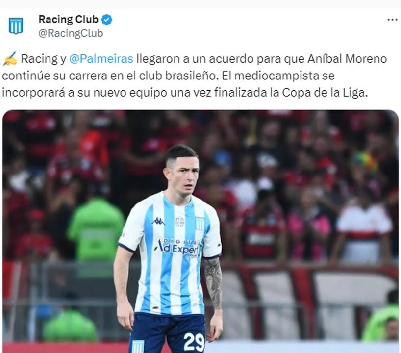 Racing oficializó la transferencia de Aníbal Moreno al Palmeiras, luego de un acuerdo por una cifra cercana a los siete millones de dólares para que el mediocampista juegue en Brasil desde la próxima temporada.