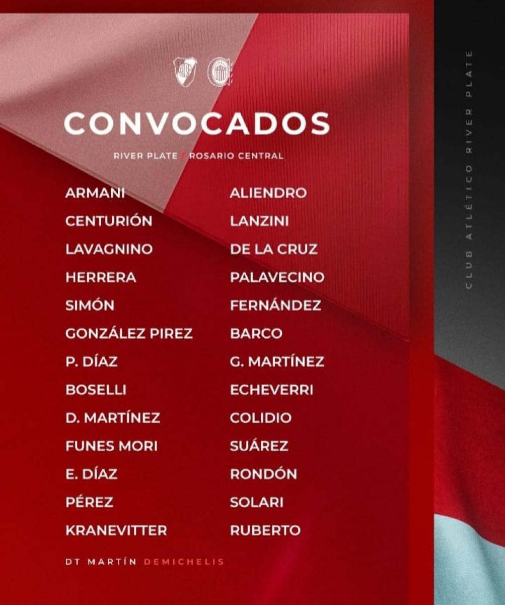 River comunicó este viernes la lista de concentrados para viajar a Córdoba donde disputará la semifinal de la Copa de la Liga Profesional ante Rosario Central, este sábado desde las 22 en el Mario Alberto Kempes, y Martín Demichelis definió dos sorpresas: en la nómina están los juveniles Claudio Echeverri y Agustín Ruberto, quienes vienen de conseguir un cuarto puesto en el Mundial sub-17 con la Selección Argentina.