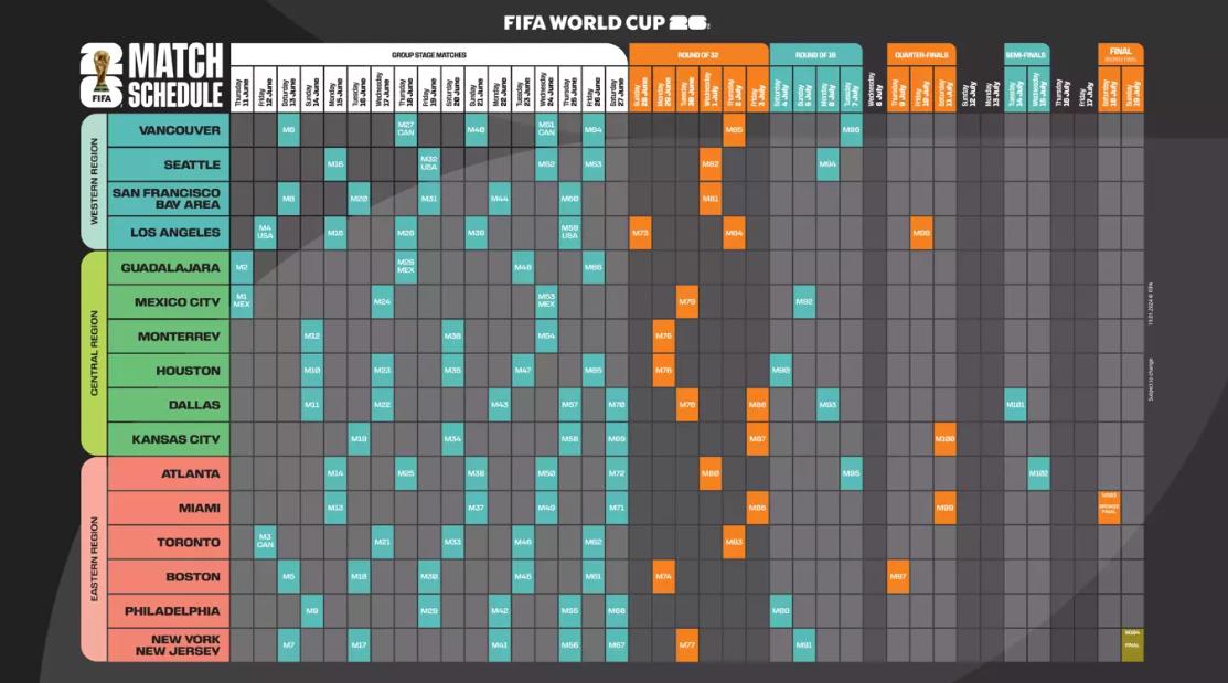 La FIFA informó el calendario completo del Mundial de 2026 que se celebrará en Canadá, Estados Unidos y México. A través de una transmisión por streaming y con la presencia del presidente de la entidad, Gianni Infantino, se conoció cómo estarán divididas las sedes en un torneo que estrenará formato con un incremento de participantes de 32 a 48 por lo que será la Copa del Mundo más grande de la historia con un total de 104 partidos.