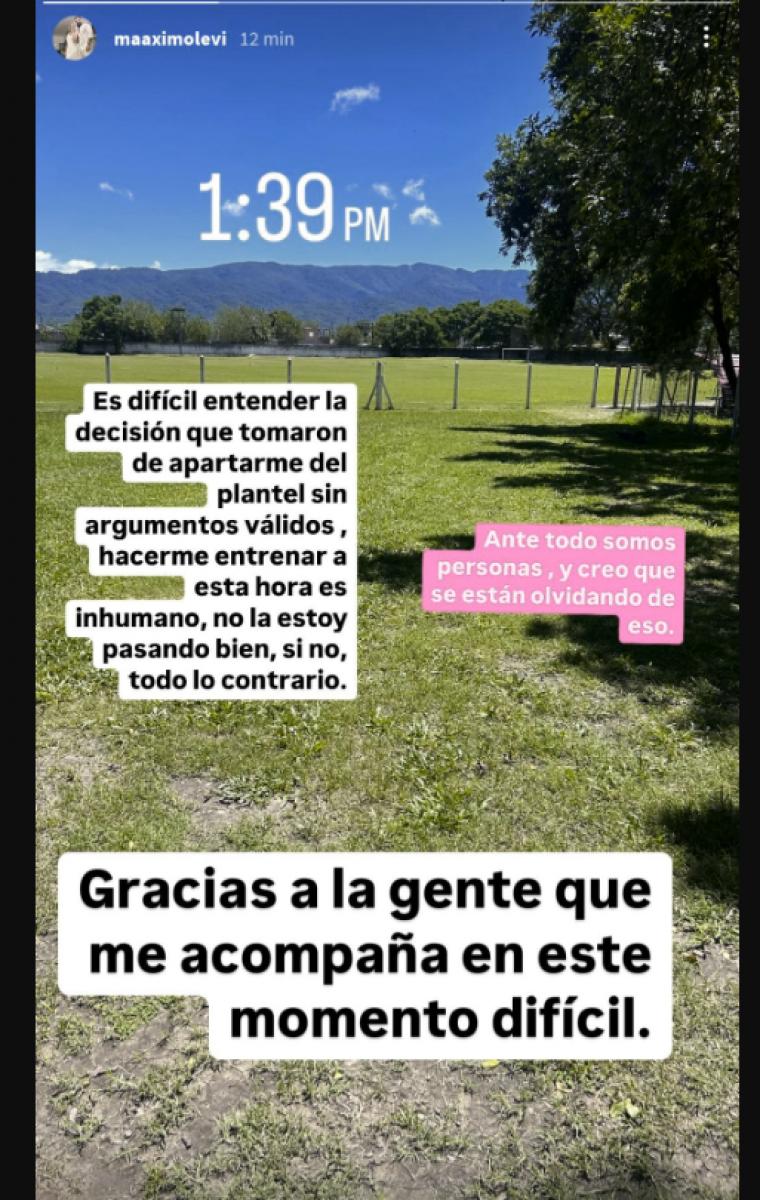 Máximo Levi subió una historia a Instagram donde aseguró que lo hacen entrenar en horarios “inhumanos”