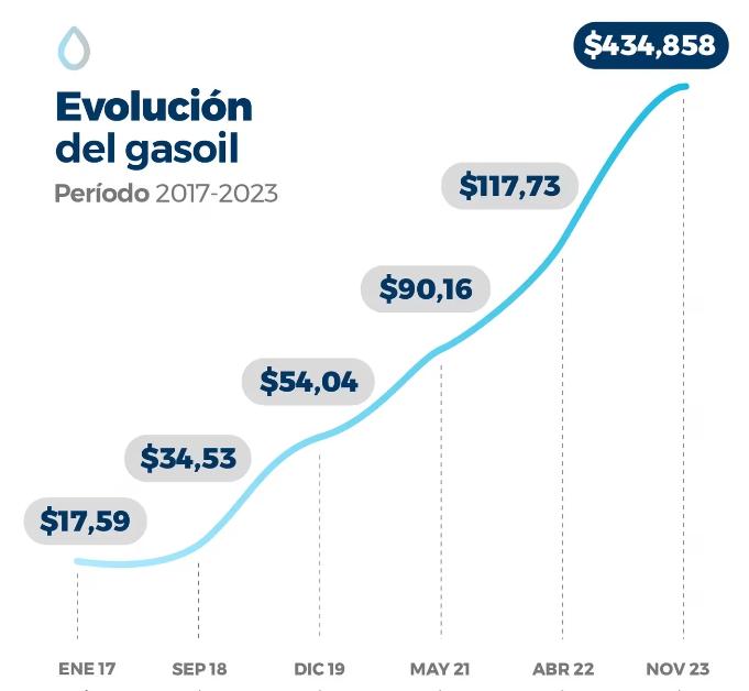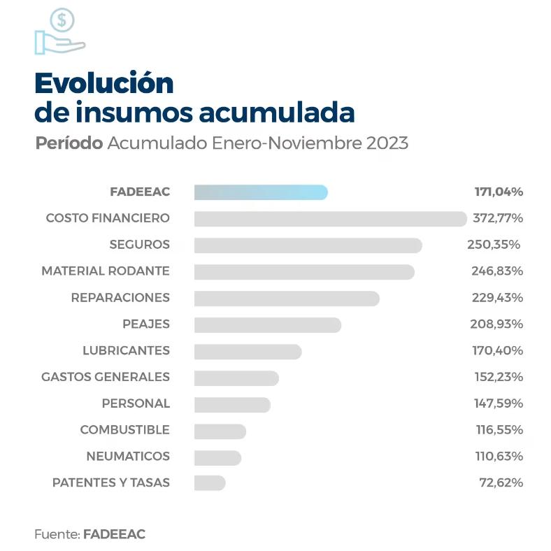 La entidad señaló que, en un contexto de un fuerte crecimiento de la inflación que se fue profundizando en la segunda parte de 2023, el combustible, insumo de mayor gravitación en los costos del sector, registró en noviembre aumentos tanto en el segmento minorista como mayorista del gasoil, luego del fuerte incremento de octubre, que llegó al 15,7%.