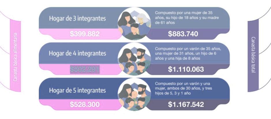 Por su parte, un hogar de cinco integrantes, compuesto por una pareja de 30 años y tres hijos de 1, 3 y 5 años, requirió $1.167.542 para superar la línea de pobreza y $528.300 para no caer en la indigencia.