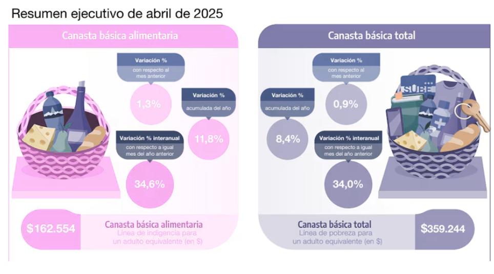 En la comparación interanual con abril de 2024, la CBA mostró una variación del 34,6%, y la CBT una variación del 34%. Estos incrementos fueron menores a los observados en meses anteriores, lo que reflejó una menor presión sobre los precios de los bienes esenciales durante el cuarto mes del año.
