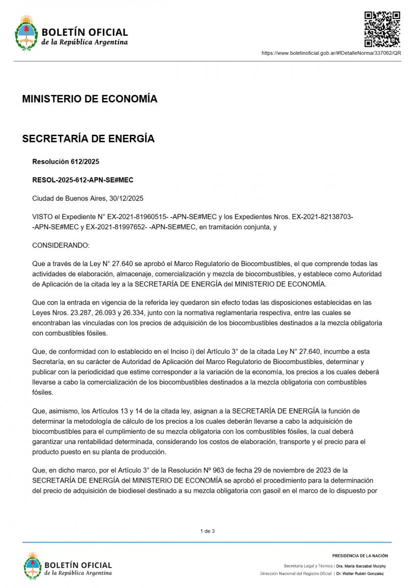 A través de las resoluciones 612/2025 y 611/2025, la Secretaría de Energía fijó los nuevos precios de adquisición del biodiesel y del bioetanol que regirán durante enero de 2026 y, al mismo tiempo, restableció el porcentaje de corte obligatorio de biodiesel en el gasoil al 7,5 por ciento, luego de la reducción transitoria aplicada en noviembre pasado.