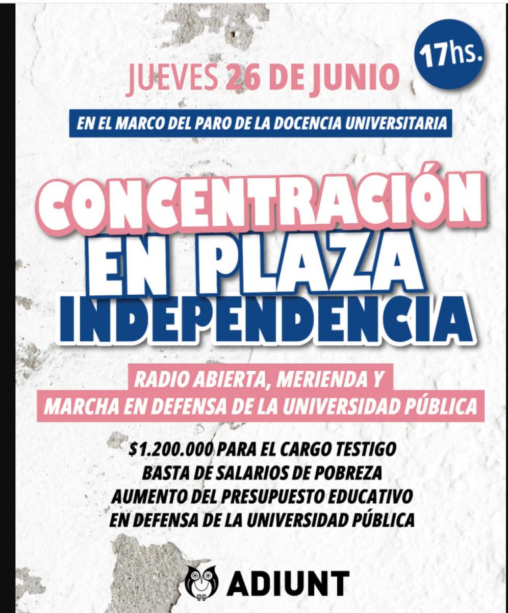 Frente a este escenario, desde ADIUNT llamamos a toda la comunidad universitaria, estudiantes, trabajadores, jubilados y todos los sectores en lucha a participar de esta nueva jornada de movilización.