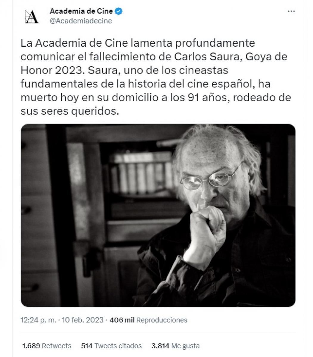 La Academia de Cine lamenta profundamente comunicar el fallecimiento de Carlos Saura, Goya de Honor 2023. Saura, uno de los cineastas fundamentales de la historia del cine español, ha muerto hoy en su domicilio a los 91 años, rodeado de sus seres queridos.