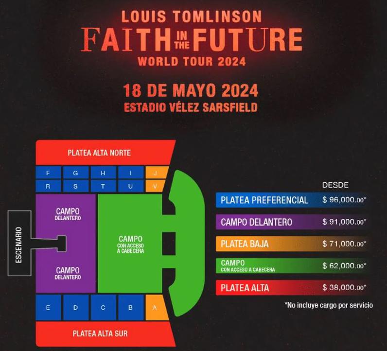 Las entradas para Louis Tomlinson en Vélez arrancan desde 38 mil pesos (Platea Alta) hasta 96 mil pesos (Platea Preferencial), más cargos de servicio.