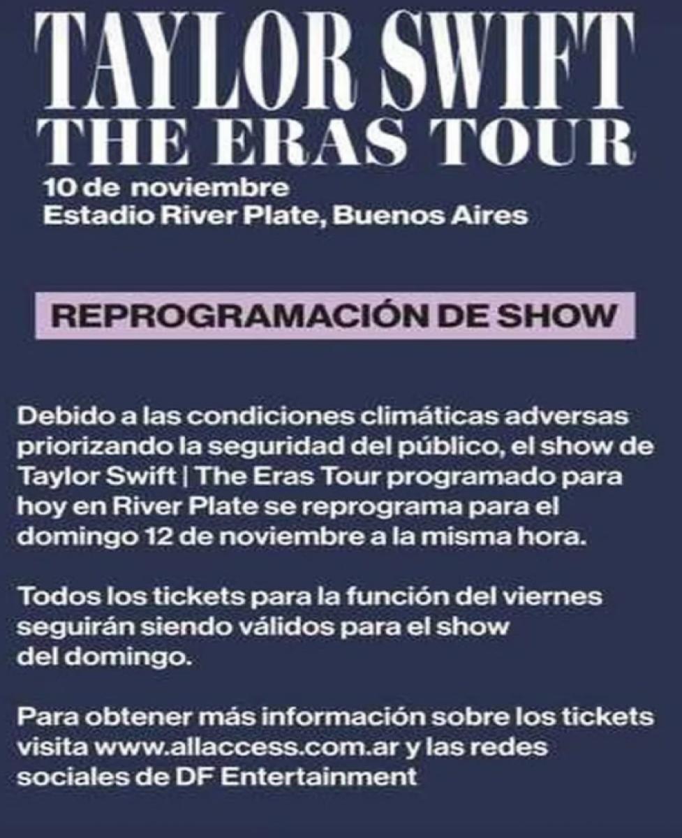 Tal como acaba de conocerse hace pocos instantes, el sitio oficial de la plataforma All Access emitió un comunicado para reprogramar la segunda presentación de la artista norteamericana Taylor Swift en Buenos Aires. La fecha reprogramada será el próximo domingo 13 de noviembre.