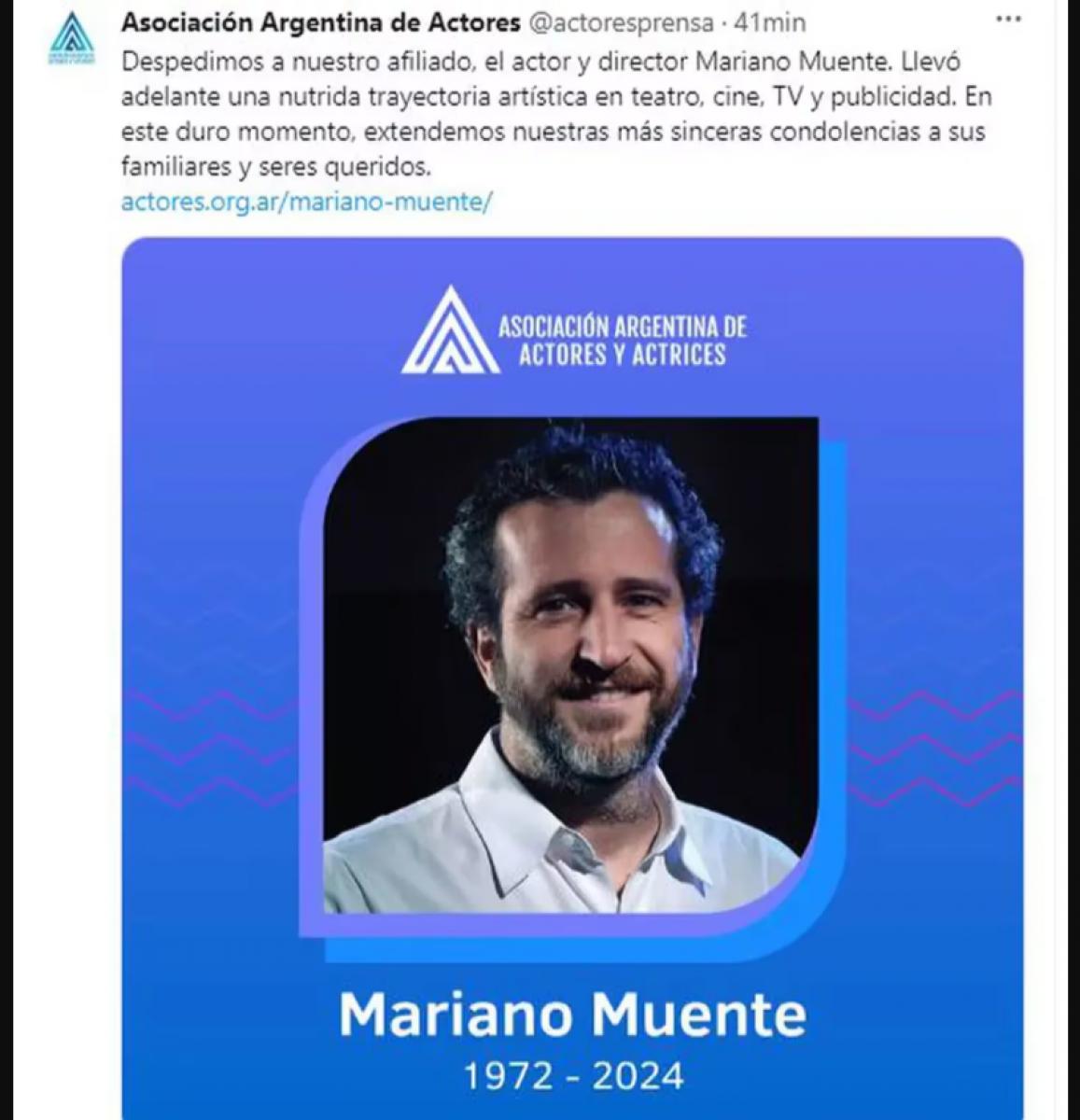 “Despedimos a nuestro afiliado, el actor y director Mariano Muente. Llevó adelante una nutrida trayectoria artística en teatro, cine, TV y publicidad”, expresaron desde la Asociación.
