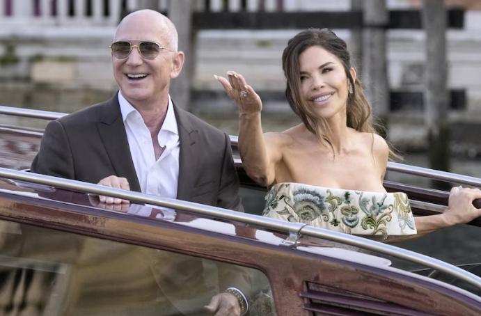 Bezos optó por un clásico traje negro y gafas tipo aviador. Ambos fueron captados saliendo del hotel Aman y ayudándose al abordar un taxi acuático rumbo a la celebración.