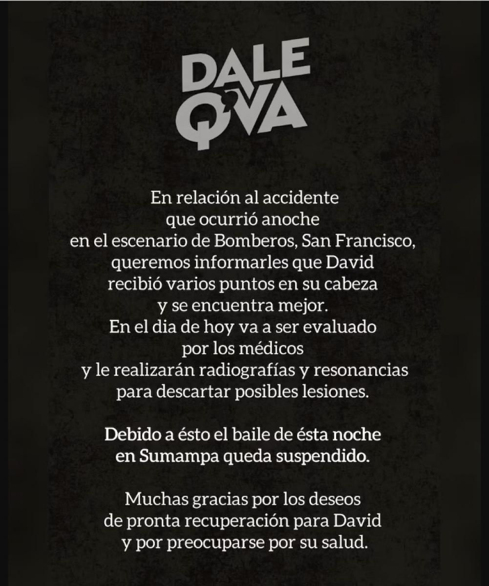 La madrugada del domingo dejó un momento de tensión en el Club Bomberos de San Francisco, Córdoba, cuando David Ortiz, el cantante de la banda de cuarteto Dale Q’ Va, sufrió una aparatosa caída en medio de un show.