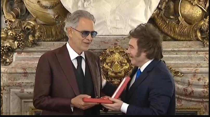 El presidente Javier Milei condecoró al músico Andrea Bocelli en la Casa Rosada, en el marco de la gira que trajo al tenor italiano a la Ciudad de Buenos Aires para realizar dos shows que incluyeron una presentación en el Teatro Colón.