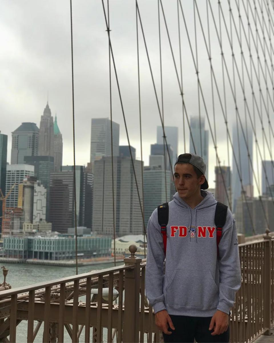 En otra de las fotos, Ibero posó en el Puente de Brooklyn, en Nueva York, con un canguro gris y letras en rojo, gorra para atrás y una mochila. En la imagen se puede apreciar una espalda bastante más angosta y menos trabajada que la actual. (Fuente: TN)
