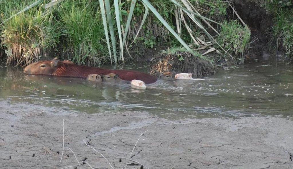 Se trata de un carpincho albino, muy particular y que rara vez se ve, pero cuando esto sucede es noticia. Su color lo hace resaltar entre sus pares, y por su tamaño se podría asumir que es un cachorro.