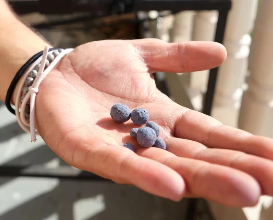 Mientras el operador maniobraba la máquina por el cielo con un mando de mano, decenas de pequeñas bolas de color tierra salían de una tolva situada en la parte inferior del drone y llovían sobre el paisaje. Cada terrón, del tamaño de una moneda de diez centavos o de 25 centavos, estaba repleto de semillas.