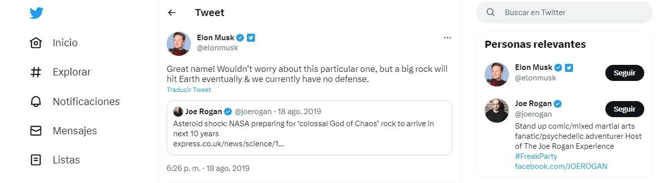 El CEO de SpaceX, Elon Musk, expresó en su momento su preocupación en Twitter por estos escenarios, afirmando que en algún momento la Tierra será impactada por un gran asteroide y que actualmente no tenemos una defensa adecuada.