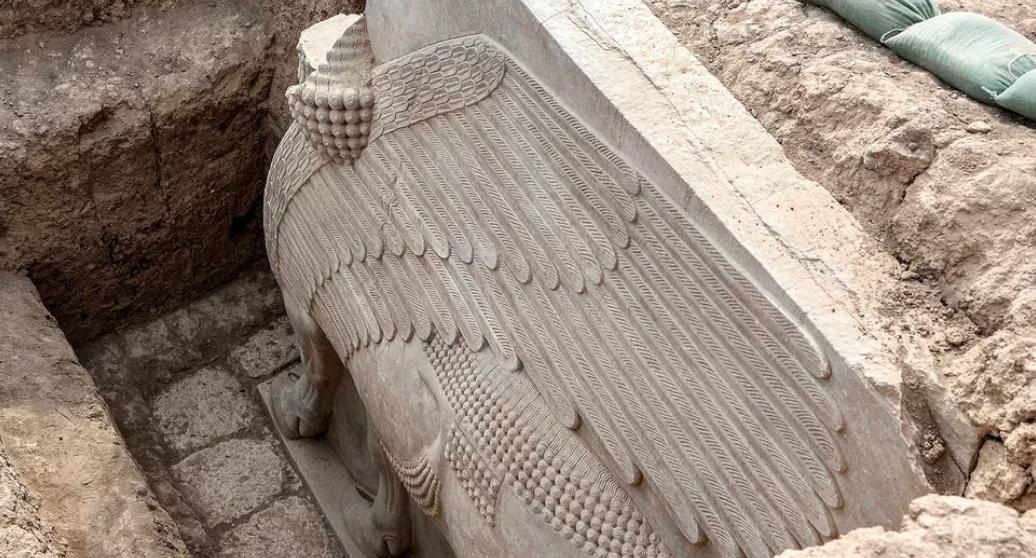 Una excavación arqueológica francesa encontró una efigie de una deidad asiria hecha de alabastro de yeso de más de 15 toneladas