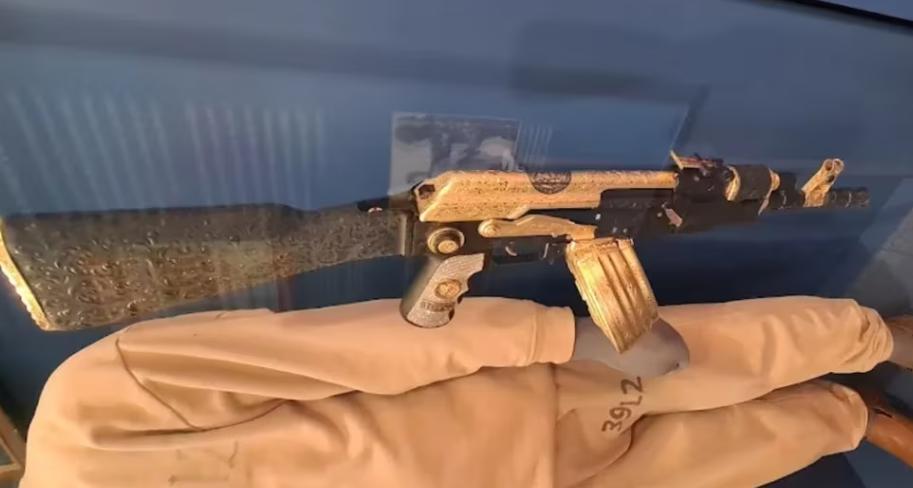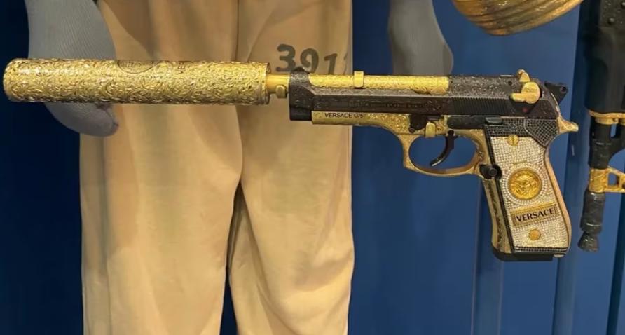 Se trata de una pistola Beretta 92 F 9MM Parabellum de 40 centímetros de longitud. Está chapada en oro, tiene incrustaciones de diamantes y cuenta con un silenciador.