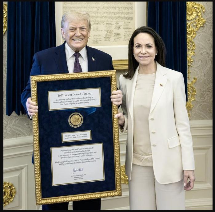 La líder de la oposición venezolana, María Corina Machado finalmente le entregó su Premio Nobel de La Paz al presidente estadounidense, Donald Trump
