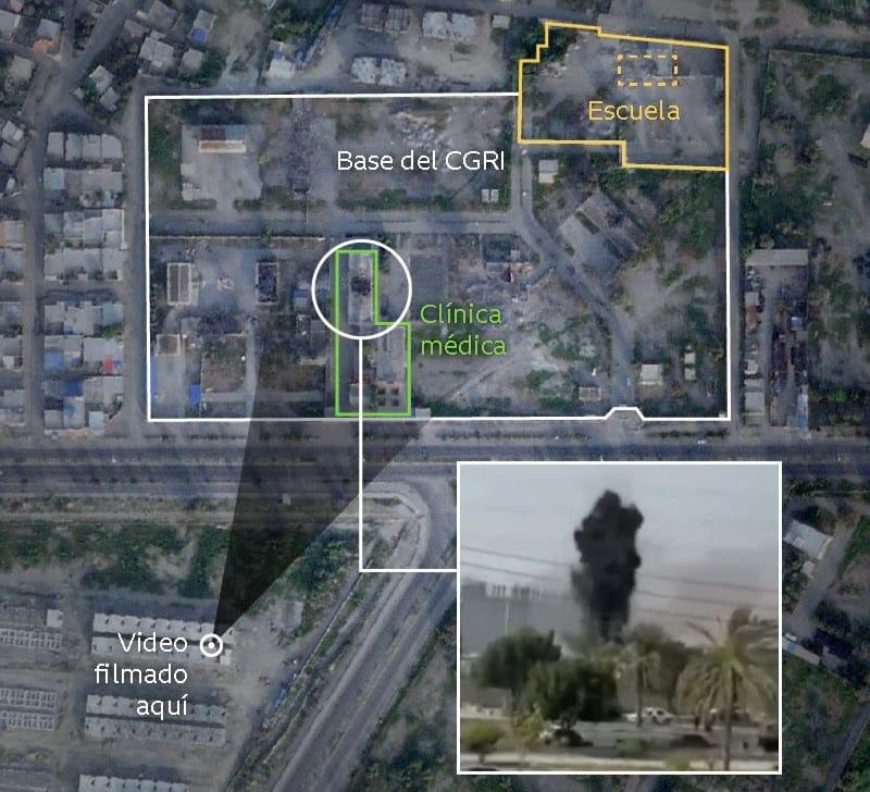 Un video publicado el domingo por la agencia de noticias semioficial iraní Mehr, cuya autenticidad ha sido confirmada por BBC Verify, muestra un misil momentos antes de impactar en una base del Cuerpo de la Guardia Revolucionaria de Irán (CGRI) junto a la escuela primaria Shajareh Tayebeh en Minab.