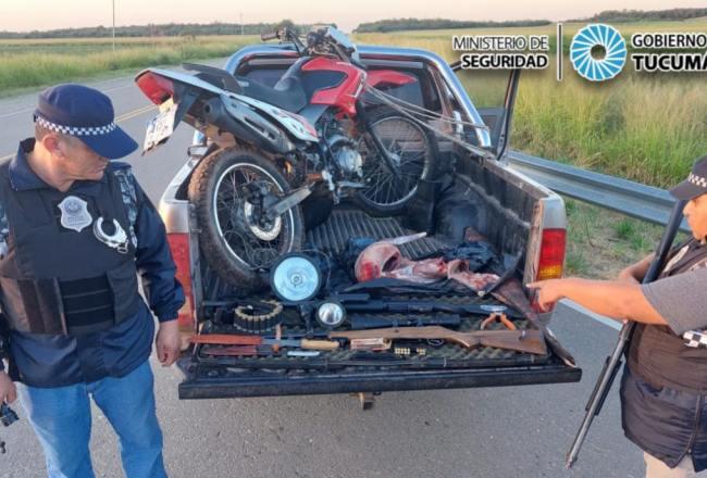 Cuando los uniformados se acercaron al vehículo observaron que en el interior iban cinco hombres de entre 24 y 62 años. En la caja llevaban una motocicleta Motomel, lo que llamó la atención de la policía y les consultaron, cuál era el motivo de su presencia en horas de la madrugada en el lugar, manifestando estas personas que se dirigían a sus respectivos domicilios luego de haber realizado la actividad de caza.