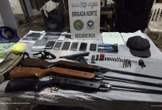 En detalle, los investigadores secuestraron un revólver calibre 32, una pistola, tres rifles de aire comprimido, 36 cartuchos de diferentes calibres de escopetas y pistolas, 7 celulares, y vestimenta utilizada por los sospechosos en el momento del hecho. Además, incautaron documentación referida al automóvil de la víctima y dos equipos de música de su pertenencia.