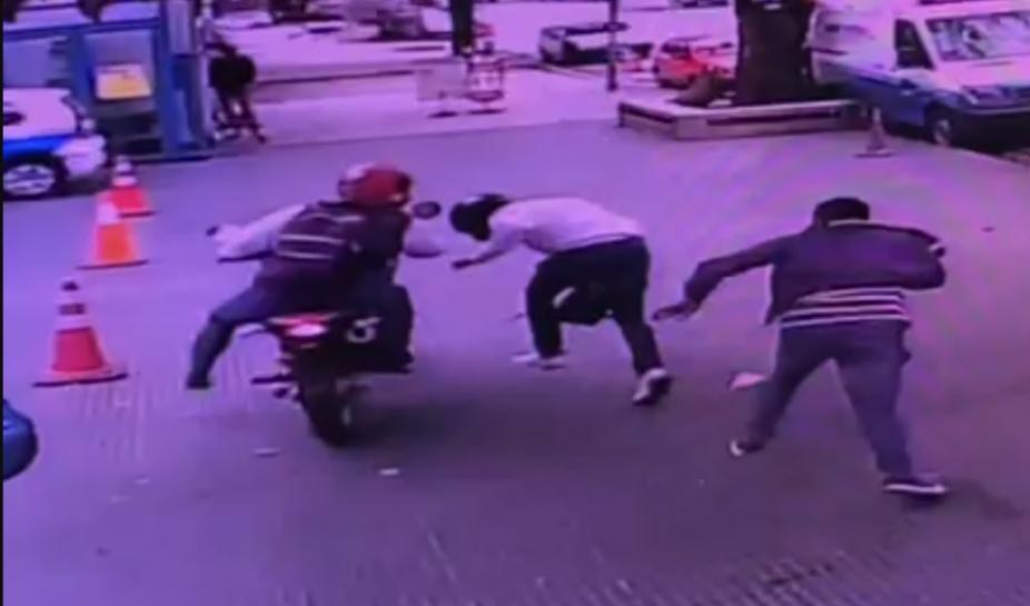 Mientras tanto, Suárez estaba parado unos metros más atrás, sobre la vereda y con un casco oscuro colocado, esperando el momento en el que la víctima fuera caminando hacia el sanatorio para atacar. Lo empujó desde atrás, lo tiró al piso, le dio varios golpes en la cara para que suelte el bolso y le rompió la tira de tanto tironear para quitárselo.
