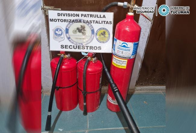 El hecho sucedió en la mañana de este miércoles en la zona del predio Ex Arsenal, cuando los suboficiales pertenecientes a la División Patrulla Motorizada Las Talitas, realizaban tareas preventivas y observaron a dos hombres cuando caminaban con dos extintores de 5 y 10 kilos. Cuando estas personas advirtieron la presencia de los motoristas, arrojaron los elementos y comenzaron a correr hacia el interior del predio donde los perdieron de vista en una zona de matorrales.