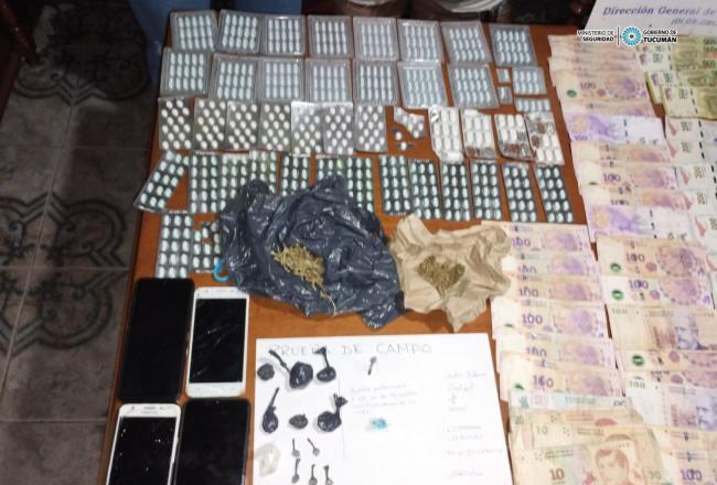 “Este domingo, personal de Didrop Capital, procedió a realizar una medida de allanamiento en un domicilio ubicado en calles Florida y Juan B. Terán de San Miguel de Tucumán, conforme con lo ordenado por el juez Federico Moeykens, y donde se procedió al secuestro de 6 bochitas de cocaína, 6 bagullos de marihuana, 1 bolsa con cogollos de marihuana, 500 pastillas de alprazolam, 113 pastillas de clonazepam, 112.530 pesos en efectivo y cuatro teléfonos celulares”, detalló Castillo.