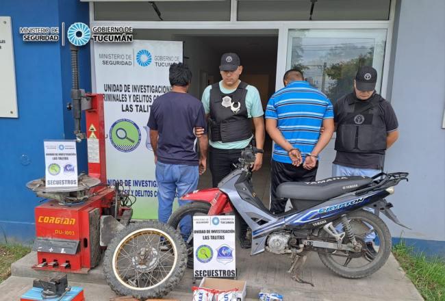 Cuando el equipo policial llegó a efectuar los allanamientos, en el interior de los domicilios encontró y secuestró una máquina desarmadora de neumáticos valuada en $2.000.000, una cadena de bici, una rueda de motocicleta, cámaras de vehículos, una tumbera,4 celulares y una moto con el alfanumérico de motor suprimido. Además, aprehendió a dos personas.
